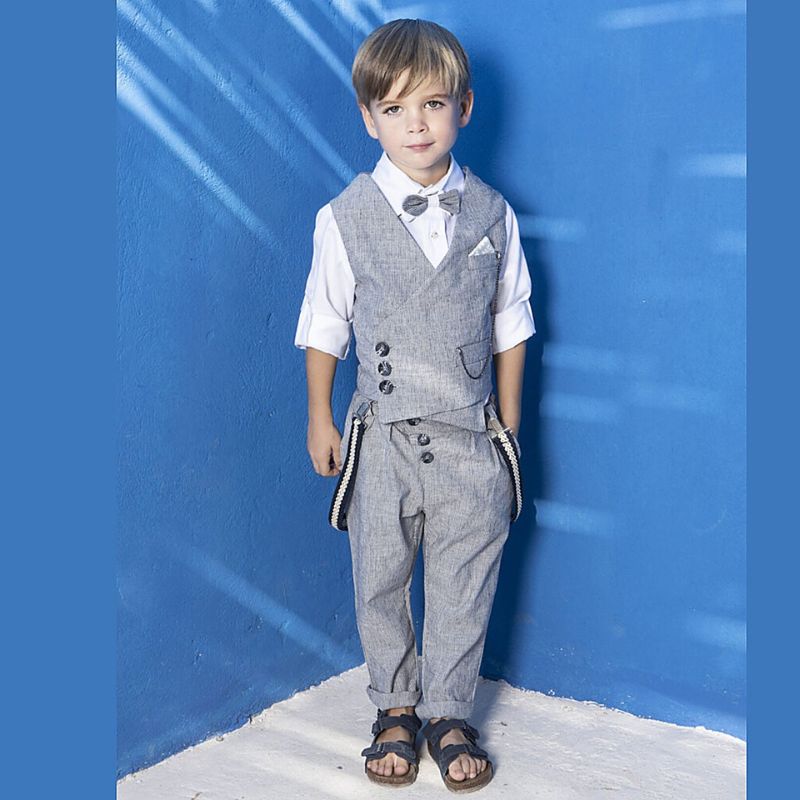 Εντυπωσιακό σέτ βάπτισης Baby Bloom της συλλογής stile di vita mediterraneo 2024 σε απόχρωση γκρι. Γιλέκο ριγέ γκρι με λοξό κούμπωμα,πουκάμισο λευκό βαμβακερό και παντελόνι ριγέ γκρί πλάγιο με πιέτες..Στο σετ περιλαμβάνονται επίσης τιράντες,υφασμάτινο παπιγιόν και ψάθινο καπέλο ή μπερές.