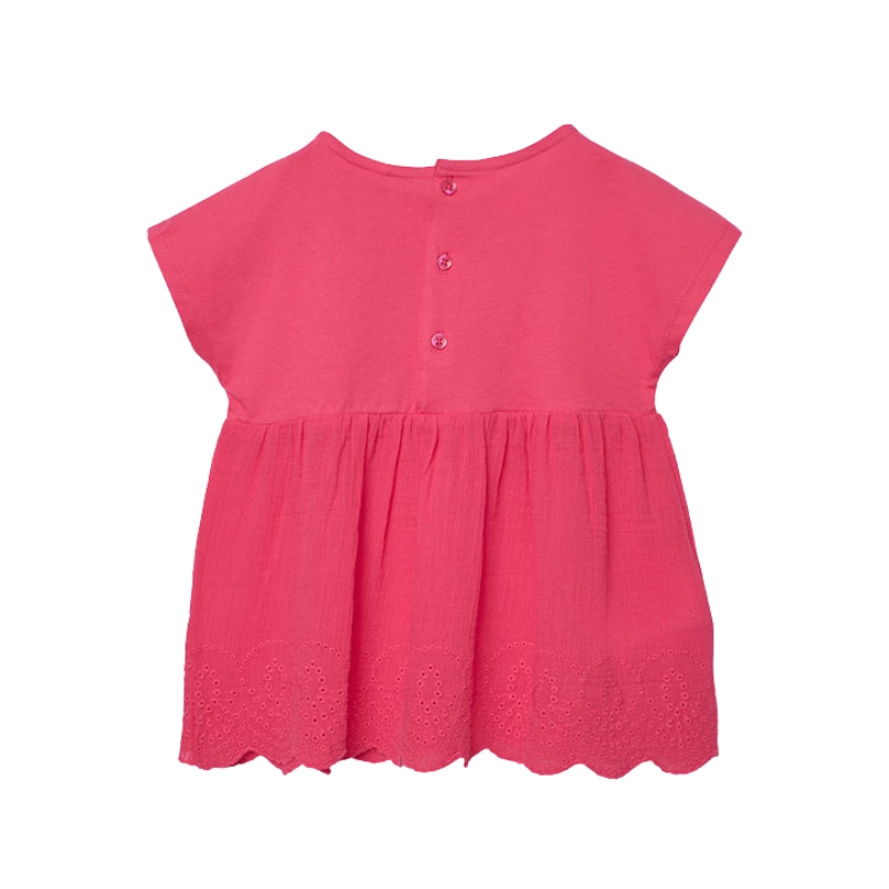 Το ποιοτικό ύφασμα προσφέρει απαλή αίσθηση στο δέρμα. Η μπλούζα εφαρμόζει σωστά στο σώμα. Δεν περιορίζει την κίνηση. Το παιδί παίζει και κινείται άνετα όλη μέρα. Το ματζέντα χρώμα ξεχωρίζει και συνδυάζεται εύκολα με σορτς, κολάν ή τζιν.