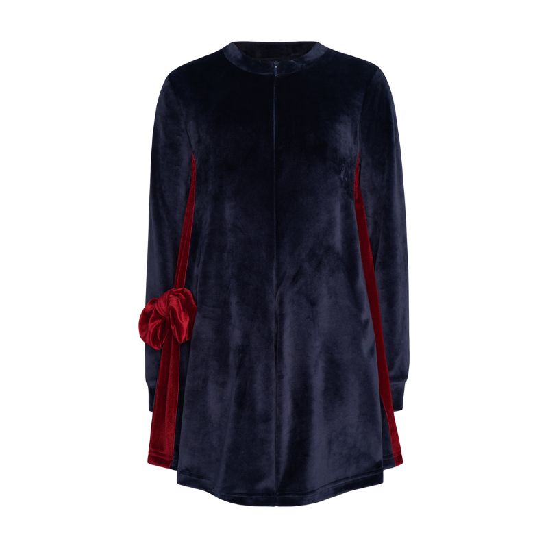 Το βελούδινο ύφασμα χαρίζει ζεστασιά και φίνα υφή, ενώ οι μίνιμαλ γραμμές και η χαρακτηριστική κόκκινη λεπτομέρεια (το bow) προσθέτουν μοναδικό χαρακτήρα και ρομαντική αισθητική.
